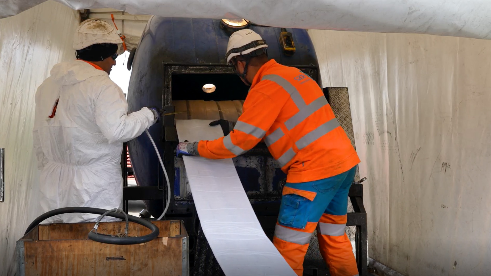 La technique de réhabilitation choisie sur ce chantier est celle du chemisage structurant inversé polymérisé à la vapeur. Cette solution couramment utilisée pour réhabiliter des réseaux d’assainissement est, ici, mise en oeuvre sur un réseau d’eau potable avec une gaine disposant d’une attestation de conformité sanitaire (ACS). Ce procédé sans tranchée répond à la volonté du SEDIF de minimiser l’impact des travaux qui prennent place sur un site très fréquenté de la commune.